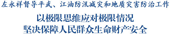 左永祥在督導(dǎo)中指出,綿陽地形地貌多樣,地質(zhì)災(zāi)害點多面廣,防災(zāi)減災(zāi)工作須臾不能放松。全市各地各部門要把人民群眾生命安全放在第一位,強化底線思維、風(fēng)險意識,以“時時放心不下”的責(zé)任感,全力以赴抓好防汛減災(zāi)和地質(zhì)災(zāi)害防治工作。要加強監(jiān)測預(yù)警,強化科技賦能,利用衛(wèi)星遙感、雷達(dá)測雨、無人機巡查等科技手段,深入開展隱患風(fēng)險排查評估,落實好預(yù)警、巡查、監(jiān)測、除險等措施,健全完善監(jiān)測預(yù)警基礎(chǔ)設(shè)施和靈敏感知系統(tǒng),延長預(yù)見期,加大人員、設(shè)備、物資等預(yù)置前置力度,快查快辦各類安全風(fēng)險隱患,為防災(zāi)救災(zāi)爭取更多主動。要剛性執(zhí)行“三個避讓”“三個緊急撤離”要求,及時做好轉(zhuǎn)移避險,統(tǒng)籌抓好資金籌措、住房建設(shè)、就業(yè)保障等工作,深入開展入戶宣傳,把轉(zhuǎn)移避險抓得更果斷更周密,確保受威脅群眾應(yīng)轉(zhuǎn)盡轉(zhuǎn)、應(yīng)轉(zhuǎn)必轉(zhuǎn)、應(yīng)轉(zhuǎn)早轉(zhuǎn)。要全面擰緊責(zé)任鏈條,加強值班值守,嚴(yán)格信息報送,落實責(zé)任人、明確責(zé)任措施、發(fā)現(xiàn)責(zé)任問題、補齊責(zé)任漏洞,切實把防災(zāi)減災(zāi)責(zé)任落實到每一個工作環(huán)節(jié)、網(wǎng)格單元。