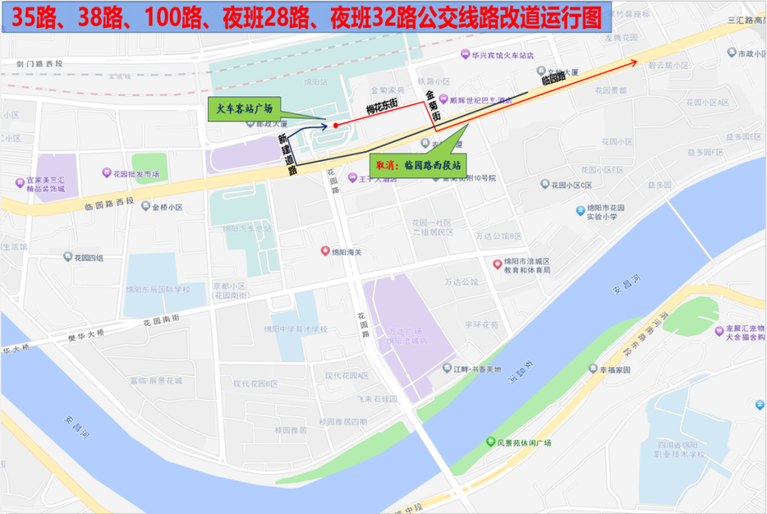 35路:火車客站廣場—沈家壩開元醫(yī)院。由火車客站廣場始發(fā),改道經梅花東街、金菊街至臨園路回原線路運行;開往火車客站廣場方向運行路線不變。