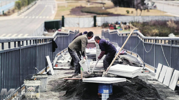 工人正在進(jìn)行跨越108國道人行天橋地磚鋪設(shè)