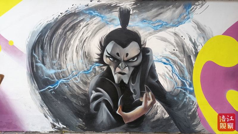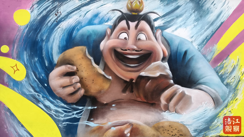 “左半幅集中描畫(huà)的是‘哪吒鬧海’的群像,右半幅則突出了李白的青年、中年、老年三個(gè)人生階段,以及他旅途中結(jié)識(shí)的摯友!”涂鴉發(fā)起人翁楚健認(rèn)為,江油既是“哪吒祖庭”,也是“李白故里”,讓兩位千古名流“同框”,是他們團(tuán)隊(duì)對(duì)江油“崇文尚武”淳樸民風(fēng)的解讀。