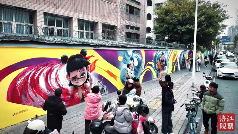 在地處江油市花園路小學(xué)后民福路一旁的近百米圍墻上,繼前幾天左半幅完美呈現(xiàn)動(dòng)漫電影《哪吒2》經(jīng)典角色,另一部動(dòng)畫(huà)電影《長(zhǎng)安三萬(wàn)里》中的李白和他的朋友們也悠然現(xiàn)身右半幅墻面,吸引慕名而來(lái)的市民紛紛圍觀拍照,贊嘆聲不絕于耳。路過(guò)此地的江油退休教師徐老師仔細(xì)打量了一番,他說(shuō):“這幾個(gè)小青年美術(shù)功底不錯(cuò),感覺(jué)哪吒就要破墻而出了。另外你看李白仰天大笑的模樣,讓人仿佛就聽(tīng)見(jiàn)了他哈哈大笑。”