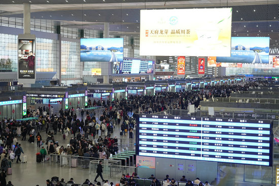 成都車站轄內(nèi)的主要火車站客流高位運(yùn)行。2月5日至2月12日,成都東站,單日發(fā)送旅客量居全路各車站發(fā)送人數(shù)首位。空鐵聯(lián)運(yùn)旅客運(yùn)輸量持續(xù)增長,雙流機(jī)場站、天府機(jī)場站分別累計(jì)送客20.5萬人次、25.6萬人次,日均送客量分別為0.5萬人次、0.6萬人次,高于往年,兩個(gè)空鐵換乘站的到達(dá)旅客量分別為21.2萬人次、29.7萬人次,均高于發(fā)送旅客數(shù)。