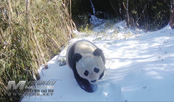 雪地上,一只圓滾滾的大熊貓向紅外相機走來。