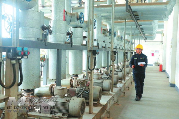 工作人員正在檢查聚酯切片生產(chǎn)線運行情況