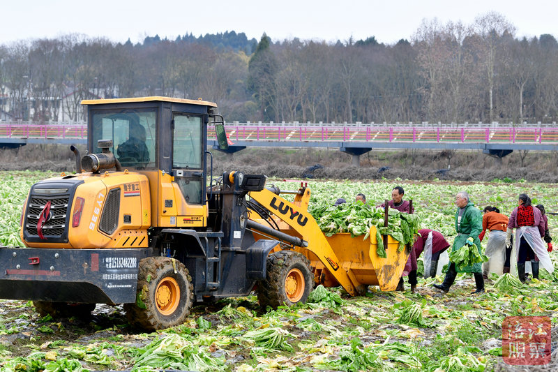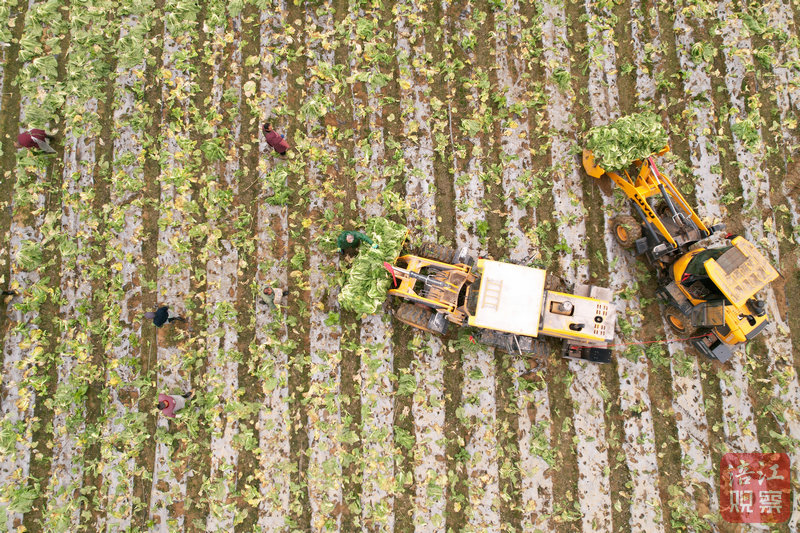 在芙蓉溪畔的勝黎村,20多位農民正在搶收近百畝地的青菜。2臺裝載機及時將砍好的青菜裝進路邊的大貨車,1臺大型農耕機在被清空的菜地里來回穿梭……