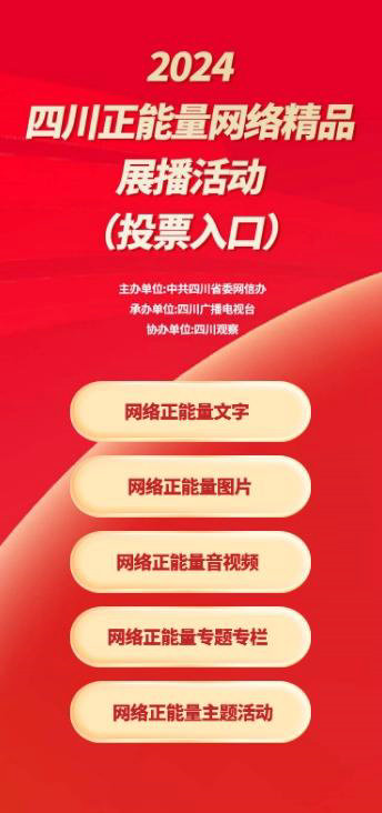 由四川省委網(wǎng)信辦主辦的2024四川正能量網(wǎng)絡(luò)精品征集展播活動和投票活動已正式開啟。本次征集活動分為媒體組和融合組兩個類別,按照網(wǎng)絡(luò)正能量文字、圖片、音視頻、專題專欄、主題活動等五個賽道進行優(yōu)秀作品征集,挖掘和傳播四川各地的正能量故事,展現(xiàn)新時代四川人民的精神風(fēng)貌。