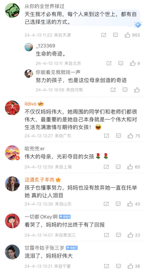 《“唐氏”川劇變臉女孩和她的蛻變》講述“唐氏”女孩殷秋華從零開始學(xué)川劇變臉,在藝術(shù)上破繭成蝶的故事,生動詮釋了個體的頑強拼搏與社會大愛的溫暖力量,將中國傳統(tǒng)文化和“唐氏寶寶”之間光芒流淌、力量奔赴,呈現(xiàn)給全世界。網(wǎng)友們?yōu)橐笄锶A的故事感動之余不禁感嘆:“殘障不是障礙,熱愛才是舞臺”“真正的美,來自內(nèi)心的堅韌”。