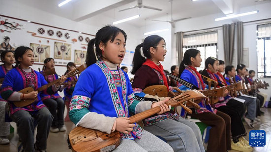 2月27日,廣西三江侗族自治縣江川小學的學生在學習彈唱侗族琵琶歌。