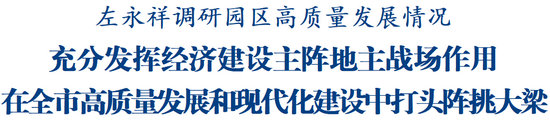 調(diào)研過程中,左永祥聽取了高新區(qū)(科技城直管區(qū))、經(jīng)開區(qū)、科技城新區(qū)加快推動(dòng)園區(qū)高質(zhì)量發(fā)展情況匯報(bào)。他強(qiáng)調(diào),今年是綿陽加快建成省域經(jīng)濟(jì)副中心三年行動(dòng)開局之年,全市園區(qū)要錨定“走在前、挑大梁”,全力以赴拼經(jīng)濟(jì)搞建設(shè),因地制宜發(fā)展新質(zhì)生產(chǎn)力,堅(jiān)定不移推動(dòng)高質(zhì)量發(fā)展,奮力實(shí)現(xiàn)一季度“開門紅”,為全市發(fā)展大局多作貢獻(xiàn)。要聚焦產(chǎn)業(yè)建圈強(qiáng)鏈,結(jié)合自身資源稟賦,統(tǒng)籌推進(jìn)特色優(yōu)勢(shì)產(chǎn)業(yè)轉(zhuǎn)型升級(jí)、戰(zhàn)略性新興產(chǎn)業(yè)培育壯大、未來產(chǎn)業(yè)前瞻布局,有效引導(dǎo)優(yōu)勢(shì)資源和優(yōu)質(zhì)企業(yè)向符合產(chǎn)業(yè)布局的園區(qū)集聚,推動(dòng)產(chǎn)業(yè)高端化、綠色化、數(shù)字化發(fā)展。要聚焦園區(qū)環(huán)境優(yōu)化,完善基礎(chǔ)設(shè)施配套,強(qiáng)化資金、用工、用能、用地保障,以企業(yè)需求為導(dǎo)向提升政務(wù)服務(wù)水平,推動(dòng)惠企政策“直達(dá)快享”,及時(shí)主動(dòng)解決企業(yè)痛點(diǎn)難點(diǎn)問題,讓企業(yè)“拎包入園”、項(xiàng)目高效落地、產(chǎn)業(yè)迅速成長(zhǎng)。要聚焦改革賦能發(fā)展,創(chuàng)新園區(qū)管理機(jī)制,完善服務(wù)體系,鍛造高素質(zhì)隊(duì)伍,在管理效能和市場(chǎng)效率上實(shí)現(xiàn)有機(jī)融合,不斷激發(fā)創(chuàng)新活力和內(nèi)生動(dòng)力。