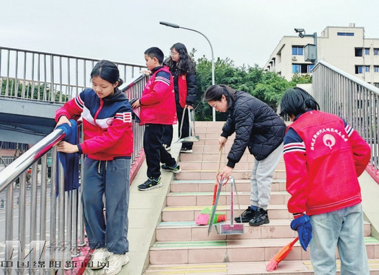 西山路小學(xué)師生在長(zhǎng)虹大道打掃。(記者 陳冬冬 攝)