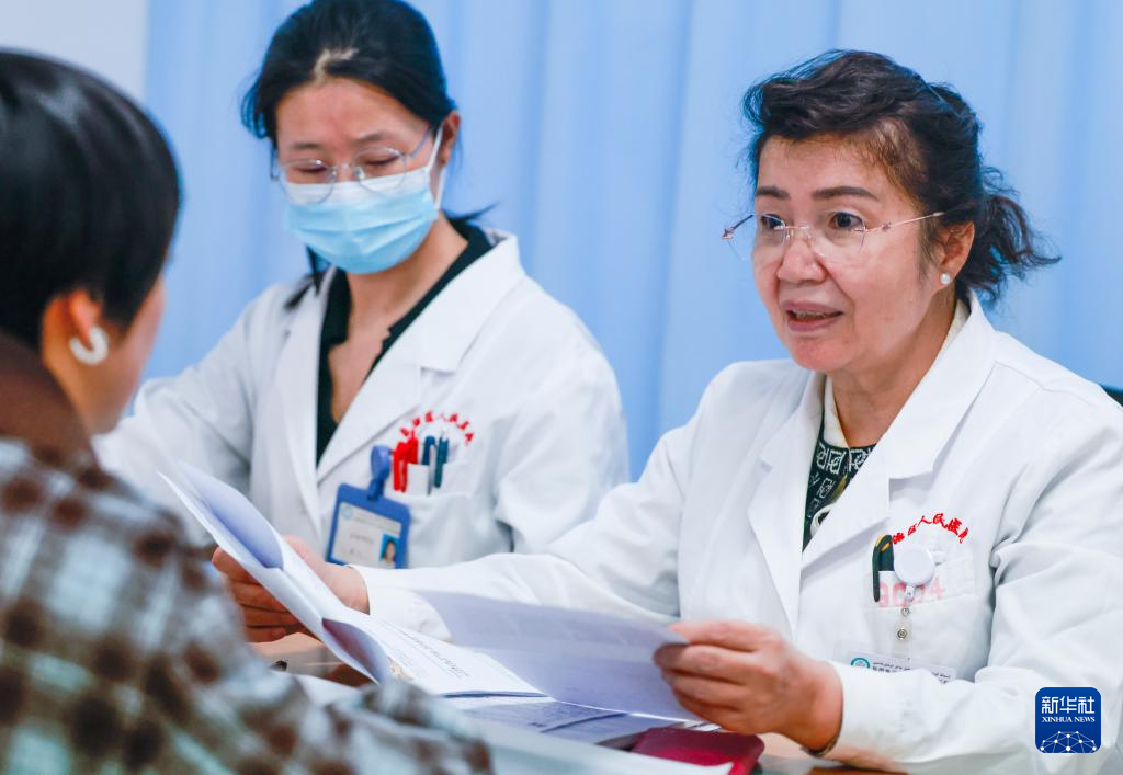 3月3日,瑪依努爾·尼牙孜(右)在新疆維吾爾自治區(qū)人民醫(yī)院為患者診療。