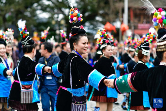 3月15日,當(dāng)?shù)厝罕娫谫F州省榕江縣三寶侗寨“薩瑪節(jié)”活動中跳“多耶舞”。