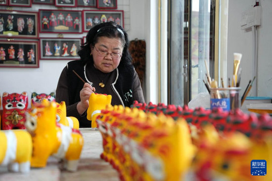 3月19日,一名村民在姜莊鎮(zhèn)制作泥老虎產(chǎn)品。