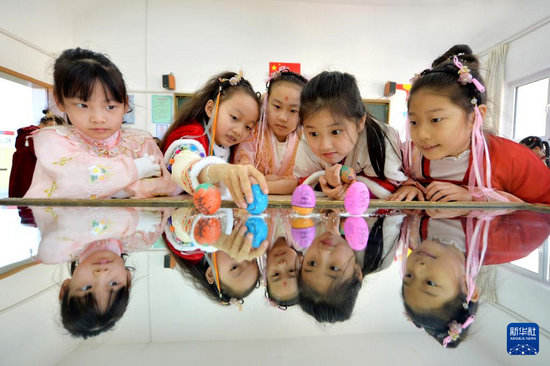 3月20日,學(xué)生們在山東青島市實驗小學(xué)開展的“傳統(tǒng)習(xí)俗迎春分”主題活動中進行豎蛋游戲。