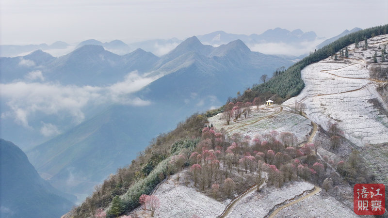 在海拔超2000米的寶桃村山巔,這場春雪與花事的邂逅更顯震撼。冰晶包裹的花瓣如同天然雕琢的水晶藝術品,遠山黛色與雪中粉韻構成層次分明的山水畫卷,引得游客驚嘆連連。