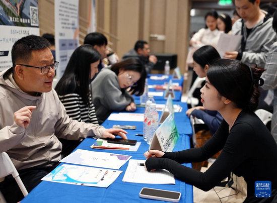 4月8日,用人單位代表在招聘會(huì)現(xiàn)場(chǎng)與求職者交流。