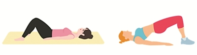 仰臥屈膝(左)和臀橋運動(右)示意圖。
