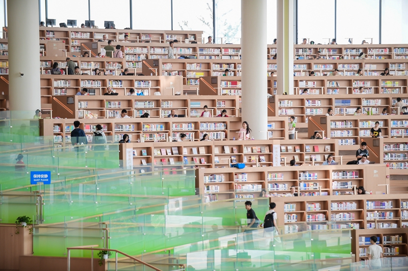 在北京城市圖書館,超挑高的山間閱覽區(qū)用一座書山展示知識文匯和數(shù)字圖景,讀者仰望間可感受文脈傳承的震撼。