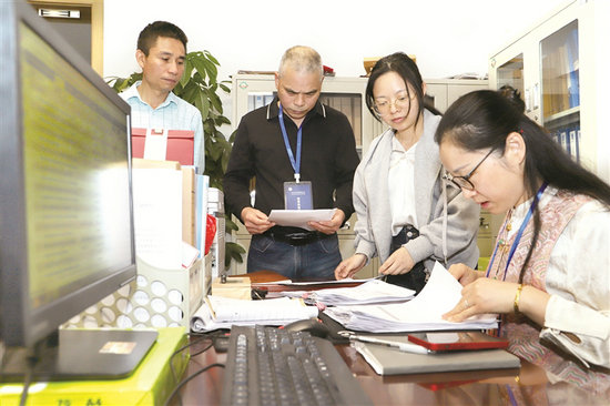 “五一”將至,浙江省金華市婺城區(qū)紀(jì)委監(jiān)委堅(jiān)守節(jié)點(diǎn),對(duì)重點(diǎn)場(chǎng)所、重要領(lǐng)域和關(guān)鍵環(huán)節(jié)開(kāi)展監(jiān)督檢查,打好糾治“四風(fēng)”組合拳。圖為該區(qū)紀(jì)委監(jiān)委聯(lián)合審計(jì)、財(cái)政等部門(mén)對(duì)某單位“三公”經(jīng)費(fèi)使用和津補(bǔ)貼發(fā)放情況進(jìn)行抽查。樓婷 攝