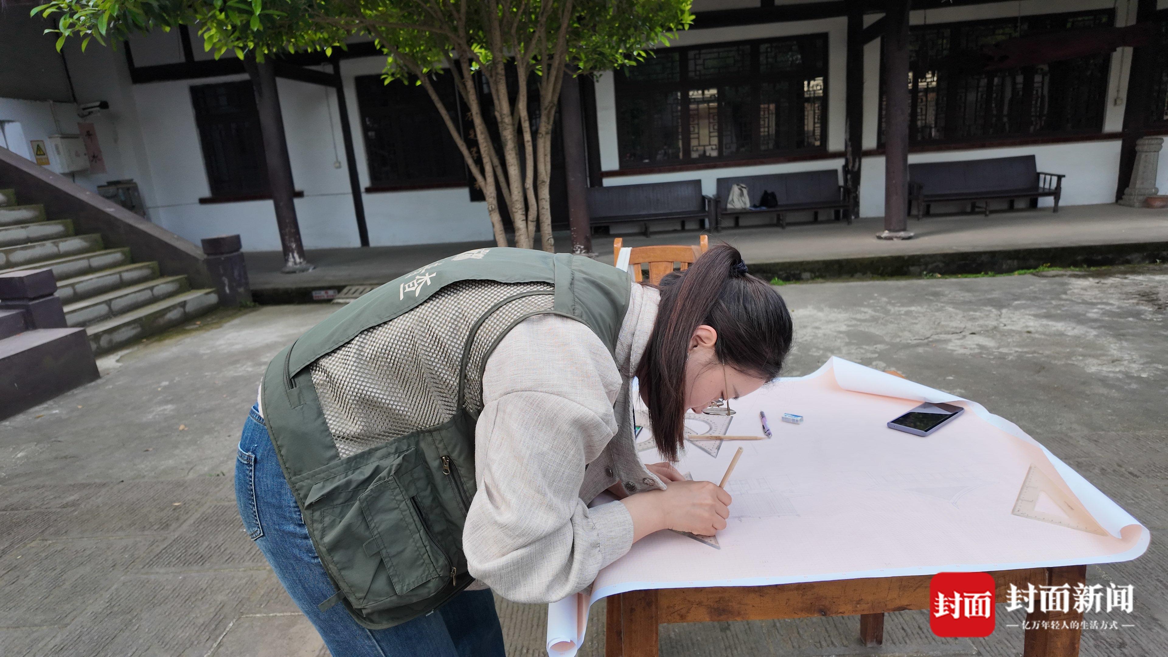 清晨時(shí)分,太陽(yáng)還未直射到古寺內(nèi),在觀音殿前的空地上擺放著一張大桌子,新津區(qū)的文物普查工作者正俯身趴在桌上,用鉛筆細(xì)細(xì)勾勒出這座古建筑的線圖。清風(fēng)拂過(guò),繪制紙上的鉛筆沙沙作響,為古寺更添一份靜謐悠然。