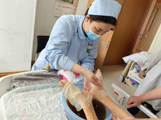 朱爺爺年逾九旬,罹患糖尿病和腦梗。入院時(shí),朱爺爺四肢癱瘓、不能動(dòng)彈,手腳浮腫,身體有褥瘡。第二天,醫(yī)院“五位一體”醫(yī)療團(tuán)隊(duì)便按照“一人一病案,一病一治療;診療有專(zhuān)人,康復(fù)有團(tuán)隊(duì)”的指導(dǎo)方針,為朱爺爺進(jìn)行了會(huì)診評(píng)估,制定了個(gè)性化的中西康復(fù)治療方案。