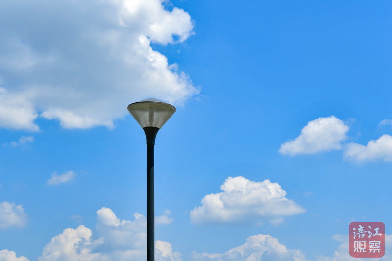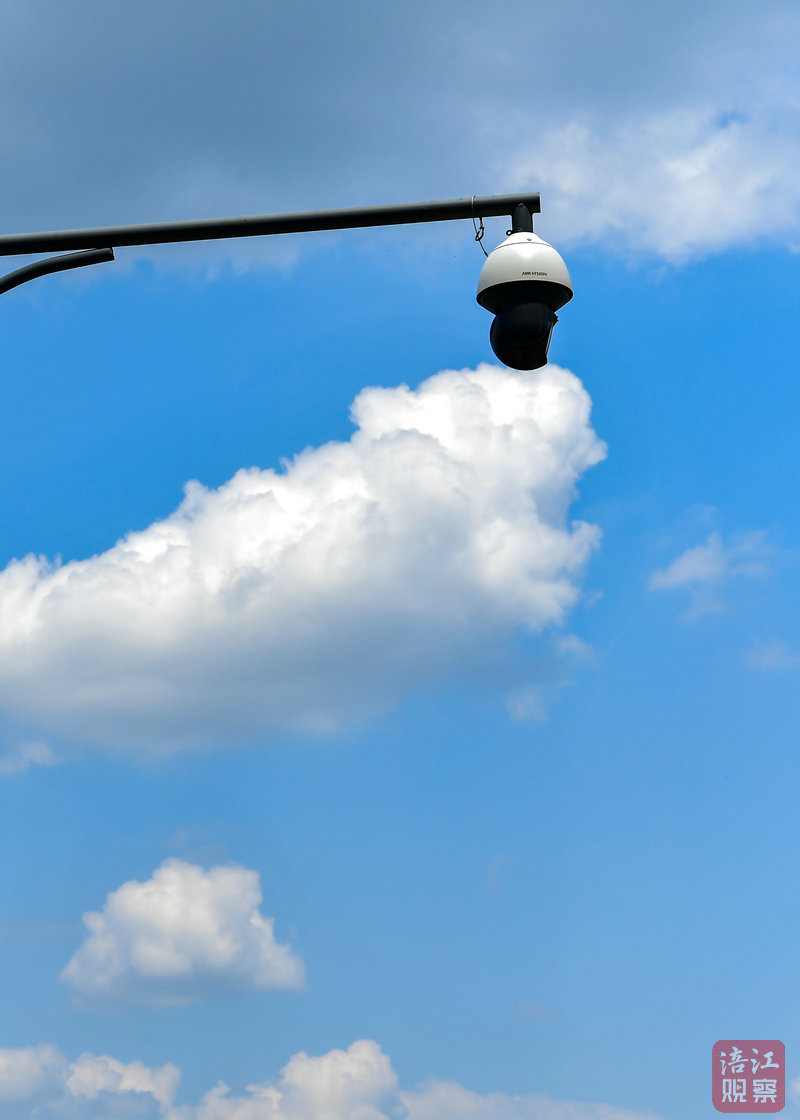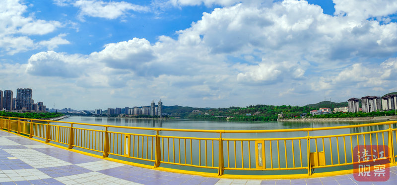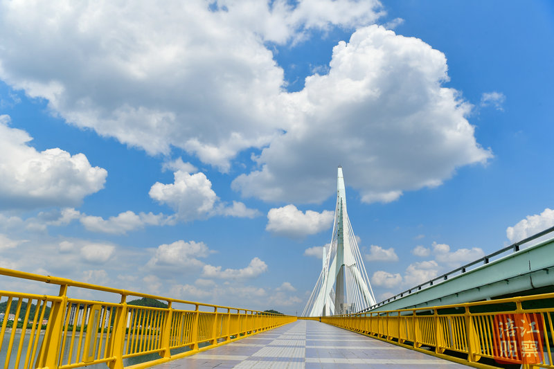 5月28日,綿陽天空湛藍,白云悠然飄蕩,三江大橋橫跨在涪江之上,雄偉又壯觀。