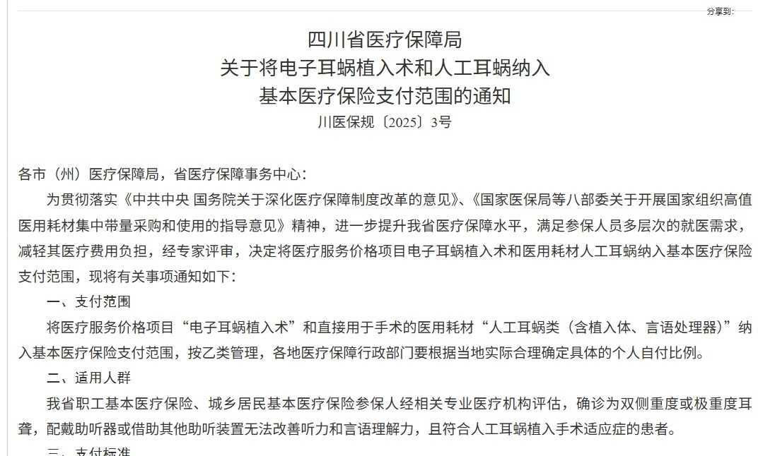 6月1日起, 四川省醫(yī)療保障局正式將電子耳蝸植入術(shù)及人工耳蝸納入基本醫(yī)療保險(xiǎn)支付范圍。全省職工基本醫(yī)療保險(xiǎn)、城鄉(xiāng)居民基本醫(yī)療保險(xiǎn)參保人,經(jīng)確診為雙側(cè)重度或極重度耳聾,且在佩戴助聽器等常規(guī)助聽方式無效,同時(shí)符合人工耳蝸植入手術(shù)適應(yīng)癥的患者,都能享受這一政策紅利。