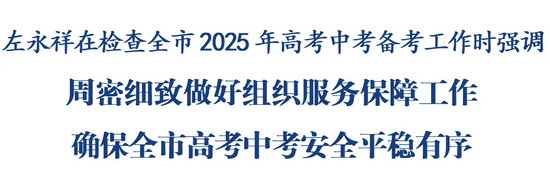 檢查中,左永祥強(qiáng)調(diào),高考中考牽動千家萬戶、事關(guān)萬千學(xué)子,是全社會高度關(guān)注的大事。各地各有關(guān)部門要進(jìn)一步提高政治站位,全鏈條抓好考前考中考后各項工作,高標(biāo)準(zhǔn)嚴(yán)要求對各個環(huán)節(jié)進(jìn)行再檢查、再完善,以扎實有力的工作成效讓考生舒心、家長安心、社會放心。要守牢安全底線,全面落實國家教育考試安全保密規(guī)定和考務(wù)管理要求,加強(qiáng)演練培訓(xùn)、強(qiáng)化技術(shù)賦能,精心做好考試組織、考試環(huán)境治理、考風(fēng)考紀(jì)建設(shè)等各項工作,全力防范失泄密、高科技舞弊等風(fēng)險。要強(qiáng)化服務(wù)保障,用心用情做好食品安全、醫(yī)療保障工作,統(tǒng)籌抓好交通疏導(dǎo)、治安管理、噪聲治理、消防安全等工作,加強(qiáng)值班值守和應(yīng)急準(zhǔn)備,盡最大努力為考生順利應(yīng)考創(chuàng)造良好條件。要扎實做好考后各項工作,強(qiáng)化后續(xù)閱卷、志愿填報、招生錄取等各環(huán)節(jié)管理,優(yōu)化考后線上線下咨詢服務(wù),積極組織開展招錄政策解讀和信息支持,有效回應(yīng)社會關(guān)切,讓考生更好圓夢未來。