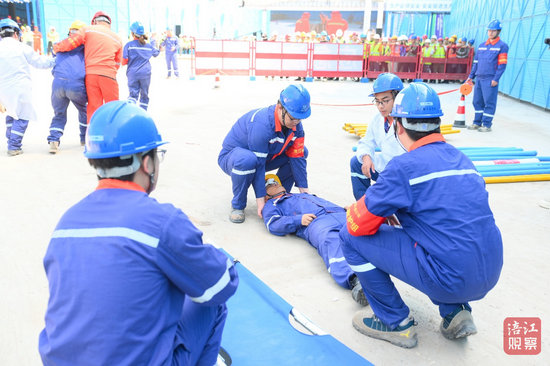 演練模擬了近年來建筑工地高發(fā)易發(fā)的施工安全事故場景。面對突發(fā)“險情”,項目應(yīng)急預(yù)案迅速啟動,聯(lián)合相關(guān)部門立即開展高效救援。演練涵蓋事故預(yù)警、應(yīng)急響應(yīng)、現(xiàn)場指揮、安全警戒、搶險救援、醫(yī)療救護等多個關(guān)鍵科目,過程緊張有序,有效檢驗了在建工地應(yīng)急處置能力。