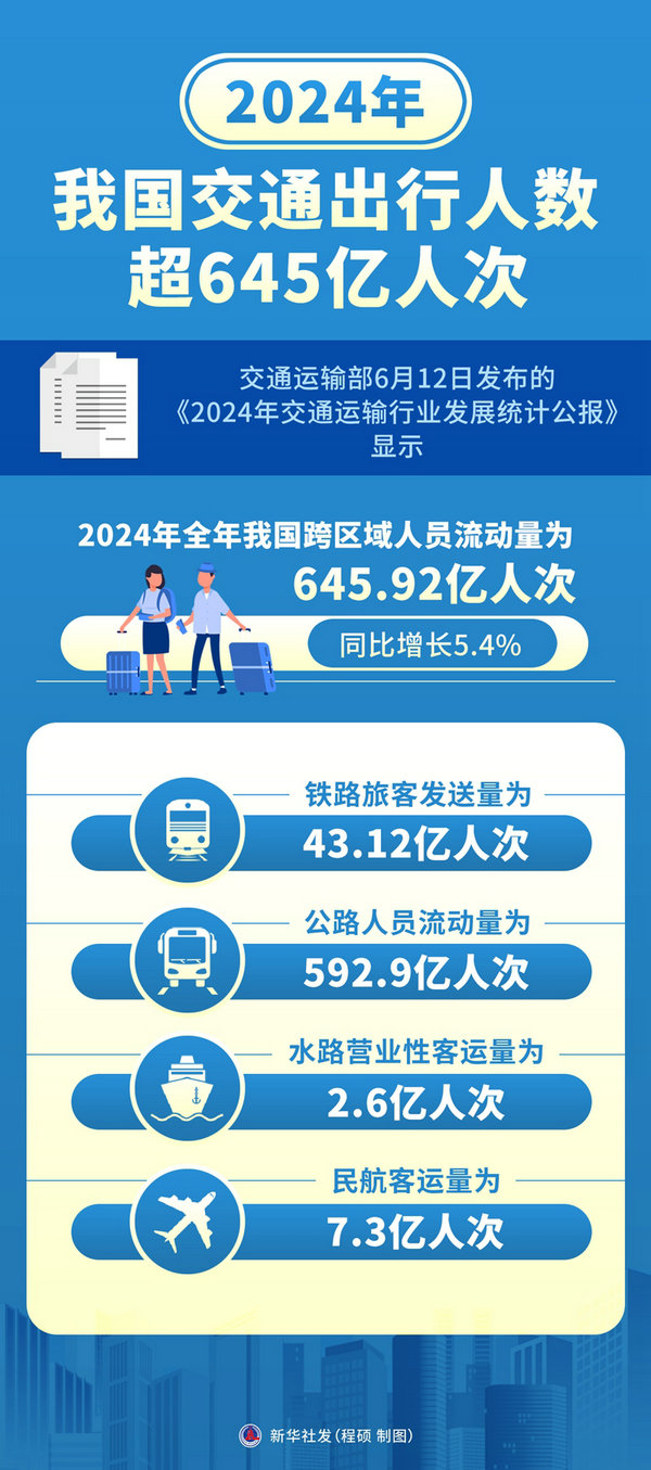 新華社北京6月12日電(記者葉昊鳴)交通運(yùn)輸部12日發(fā)布的《2024年交通運(yùn)輸行業(yè)發(fā)展統(tǒng)計公報》顯示,2024年全年我國跨區(qū)域人員流動量為645.92億人次,同比增長5.4%。
