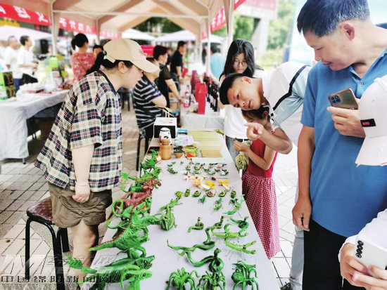 非遺展示區(qū)內(nèi),涪城綿陽米粉、游仙董氏扎染技藝、安州葫蘆烙畫、北川羌族草編、三臺郪江米花糖、梓潼糖畫、江油青蓮刺繡等近20項(xiàng)非遺手作體驗(yàn),吸引了許多市民駐足觀看。一位小朋友和父母一起來到北川羌族草編展臺前,看見栩栩如生的草編小動物,既喜歡,又害怕,最后在母親的鼓勵下,才和草編小動物來了一次親密的接觸,傳統(tǒng)非遺草編的魅力從此深深刻進(jìn)了這位小朋友的腦海。