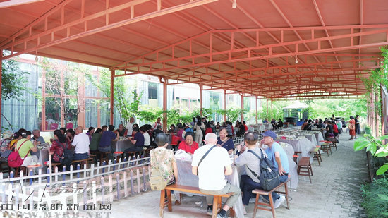 當(dāng)天,在采摘園內(nèi)的餐廳,坐滿來采摘的游客,正品嘗當(dāng)?shù)氐奶厣朗场?ldquo;一進(jìn)園子,很好的感覺,有小番茄、桃子、野菜,還有梓潼最出名的片粉,真的很不錯(cuò)。”游客董彩云說。
