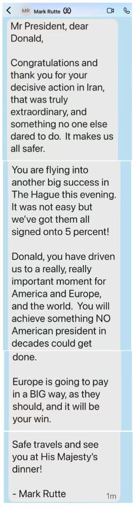 為達(dá)成這一成果,呂特在峰會(huì)召開前做了大量協(xié)調(diào)工作,勸說(shuō)歐洲領(lǐng)導(dǎo)人同意這一計(jì)劃。特朗普24日在社交平臺(tái)“真實(shí)社交”展示了呂特發(fā)給他的短信。呂特在短信中祝賀并感謝特朗普在伊朗的軍事行動(dòng)“讓我們更加安全”,并表示特朗普“在海牙將取得另一項(xiàng)重大勝利”。他說(shuō),歐洲國(guó)家已承諾大幅提高防務(wù)支出,“這是歐洲應(yīng)該做的,這也是你的勝利”。
