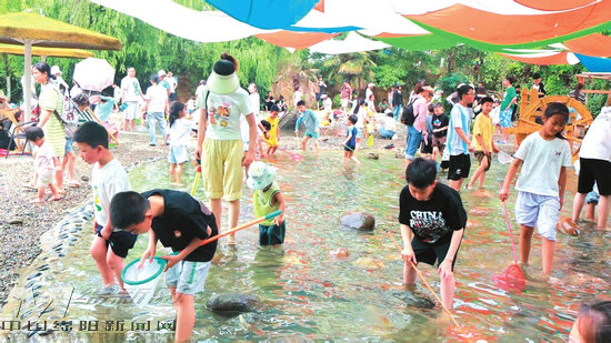 如果說方特的潑水節(jié)充滿狂歡氛圍,那么蝸牛部落的夏日戲水則充滿了童趣。這里精心打造了戲水樂園、趕海樂園以及玩水主題活動。在樹蔭遮蔽的淺水池中,小朋友們赤腳踩在清涼溪水里摸蟹、抓泥鰍、撈小魚,樂趣無限。在稍深的水域,“渾水摸魚”活動更是將歡樂氛圍推向高潮。工作人員現(xiàn)場將大魚投放在渾水區(qū),隨著一聲令下,孩子們和家長沖進水里,圍堵四處逃竄的魚。有的小朋友成功抓到魚后,滿臉自豪地向父母展示;也有的小朋友在水中手忙腳亂,卻怎么也抓不住靈活的魚兒?,F(xiàn)場驚叫聲、歡呼聲此起彼伏,充滿了童真與歡樂。