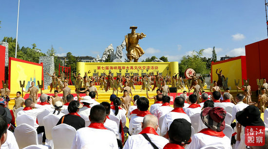 上午9時45分,大禹誕辰民俗文化展示活動拉開序幕。莊嚴(yán)的九響禮銃,象征著大禹平定九州的豐功偉績;深沉有力的三十四通鼓聲,寄托著全國各地對中華先祖的深切懷念;悠揚(yáng)的九聲鐘鳴,承載著十四億炎黃子孫對治水英雄的崇高敬意。兩岸嘉賓代表敬獻(xiàn)花籃,表達(dá)對華夏治水始祖的敬仰和尊崇。中國先秦史學(xué)會副會長彭邦本恭讀《頌大禹文》。兩岸嘉賓起立,手執(zhí)羌紅,面向大禹像三鞠躬,活動在頌歌獻(xiàn)舞中圓滿禮成。