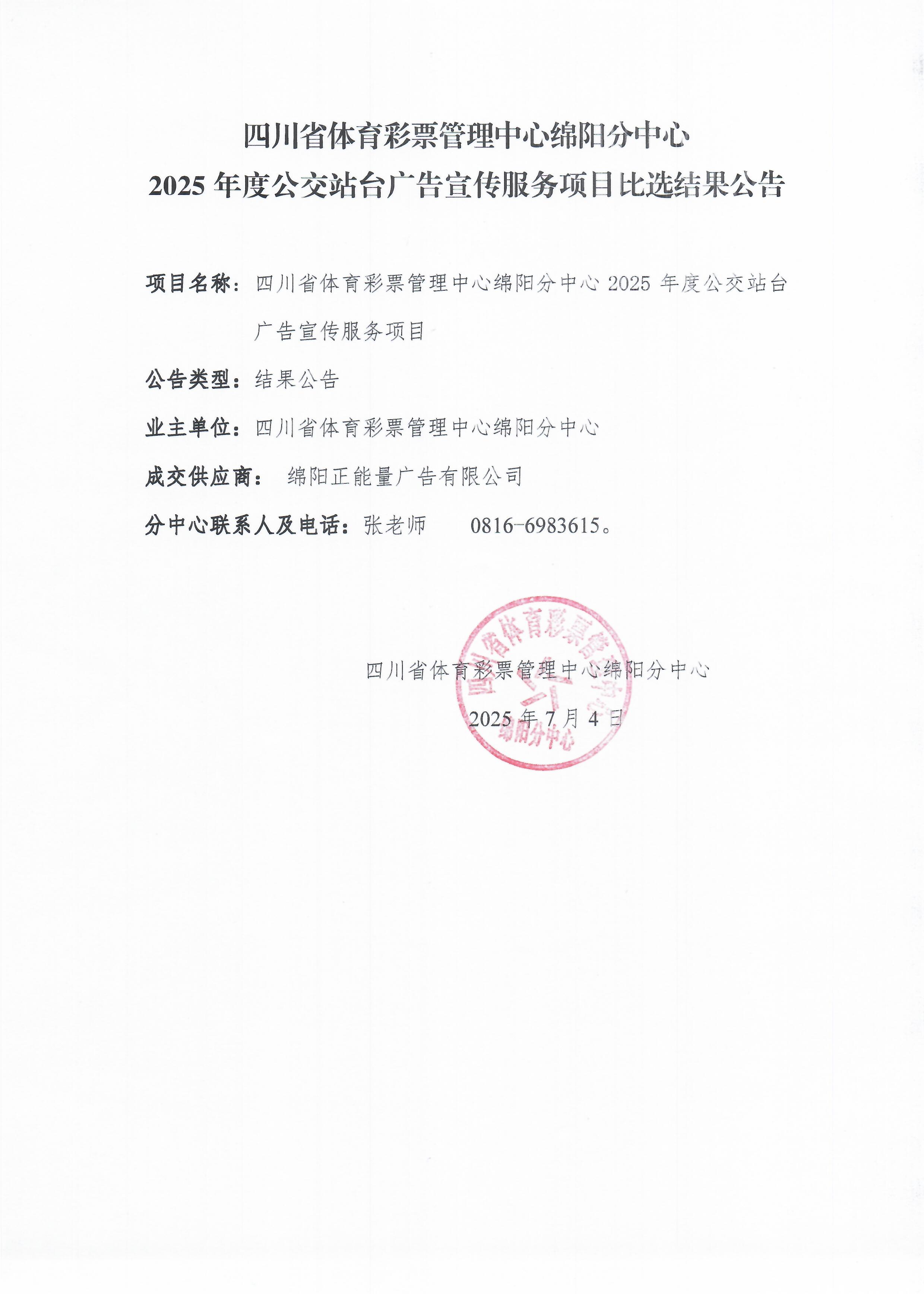 四川省體育彩票管理中心綿陽(yáng)分中心2025年度公交站臺(tái)廣告宣傳服務(wù)項(xiàng)日比選結(jié)果公告