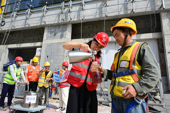7月11日,在中鐵建工青島國際郵輪港區(qū)航運中心項目工地,外墻安裝工姜廣生(右一)在作業(yè)間歇接受工友送來的綠豆湯。