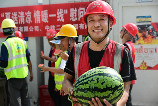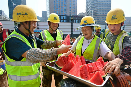 7月11日,在中鐵二局青島地鐵5號線青醫(yī)東站項目工地,工人在作業(yè)間歇領(lǐng)取西瓜。