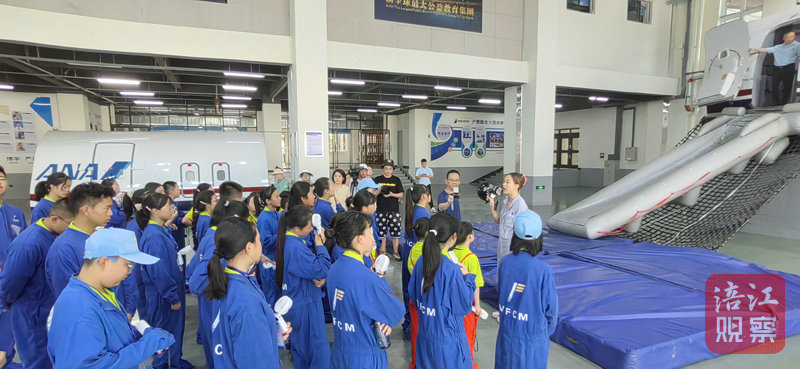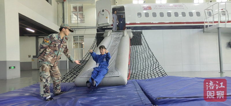 隨后的靜艙逃生演習(xí)更是將活動(dòng)推向了高潮。在老師的鼓勵(lì)和耐心指導(dǎo)下,大家按照動(dòng)作要點(diǎn)勇敢嘗試。只見孩子們從“飛機(jī)”上滑行而下,成功完成“逃生”,那一刻,他們臉上洋溢出自豪與喜悅。有的少年意猶未盡,甚至主動(dòng)再次走上“飛機(jī)”,進(jìn)行第二次體驗(yàn),在實(shí)踐中不斷鍛煉自己。