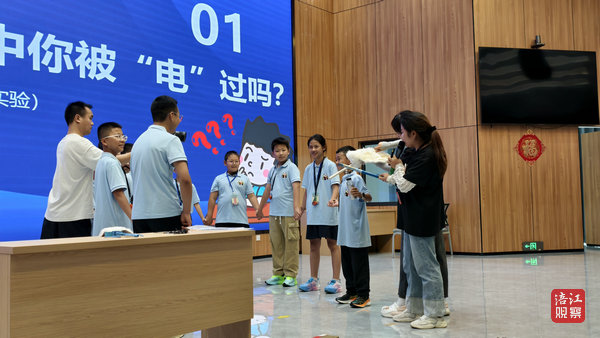 “同學們,見證奇跡的時刻到了!”在魔法靜電課堂上,一名營員用羊毛布摩擦塑料棒,產(chǎn)生的靜電在萊頓瓶中緩緩積蓄,另外十名營員手拉手圍成圓圈,當其中一名營員觸摸到充電后的金屬球時,電流瞬間傳遍“人體導電鏈”,驚呼聲與歡笑聲交織成一片。“電流非??焖俚貜奈业纳眢w里穿過了,感覺麻麻的!”臺下的營員們爭先恐后地舉起小手,想?yún)⒓酉乱唤M實驗的呼喊聲此起彼伏。