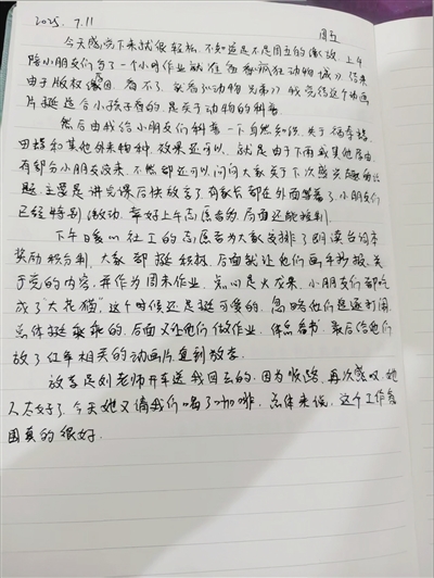“今天依然很充實(shí),教學(xué)氛圍也很舒服,下班以后也得準(zhǔn)備好周四、周五的講課內(nèi)容,還要給他們看一些合適的動(dòng)畫電影,感覺這樣的生活慢慢步入正軌了……”