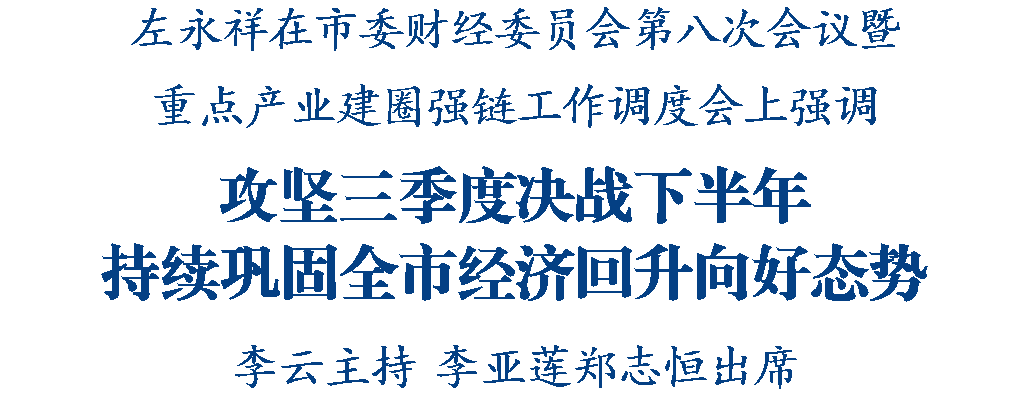 7月24日,市委財經(jīng)委員會第八次會議暨重點(diǎn)產(chǎn)業(yè)建圈強(qiáng)鏈工作調(diào)度會召開,省委常委、副省長、市委書記左永祥出席會議并講話。他強(qiáng)調(diào),要深入學(xué)習(xí)貫徹習(xí)近平總書記對四川工作系列重要指示精神,全面落實(shí)黨中央和省委關(guān)于做好經(jīng)濟(jì)工作的決策部署,保持定力、堅定信心,攻堅三季度、決戰(zhàn)下半年,持續(xù)鞏固全市經(jīng)濟(jì)回升向好態(tài)勢,為全省發(fā)展大局貢獻(xiàn)更多綿陽力量。