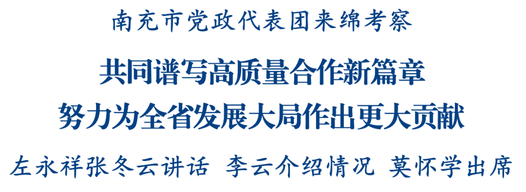 張冬云在講話中代表南充市委、市政府對代表團(tuán)一行在綿陽受到的周密安排表示感謝,對綿陽欣欣向榮的發(fā)展態(tài)勢表示祝賀。他說,綿陽與南充地域相鄰、人文相親,有著共同的生活習(xí)俗和文化基礎(chǔ)。如今,都肩負(fù)著建成省域經(jīng)濟(jì)副中心的重任,兩地交流合作更加緊密深入。綿陽作為中國唯一科技城,推動科技創(chuàng)新的專注定力、推進(jìn)重點產(chǎn)業(yè)建圈強鏈的寶貴經(jīng)驗、擴大對外開放的有力舉措以及干部真抓實干奮進(jìn)有為的優(yōu)良作風(fēng),值得南充認(rèn)真學(xué)習(xí)借鑒。他指出,南充是國家規(guī)劃定位的成渝地區(qū)北部中心城市和省委、省政府培育的川東北省域經(jīng)濟(jì)副中心,是區(qū)域交通樞紐、紅色革命老區(qū)、宜居宜游城市。南充堅定貫徹黨中央和省委決策部署,去年以來謀劃實施“1558”工作思路,奮力推動經(jīng)濟(jì)社會高質(zhì)量發(fā)展。今年以來,把“全力打贏經(jīng)濟(jì)發(fā)展翻身仗”作為今明兩年的工作總抓手,堅持既立足當(dāng)前、全力以赴抓出立竿見影的短期增長成效,又著眼長遠(yuǎn)、久久為功奠定夯基壘臺的長期發(fā)展支撐,推動經(jīng)濟(jì)加快向好、跨越升位。希望兩市健全多層次合作機制,在交通物流、產(chǎn)業(yè)發(fā)展、科技創(chuàng)新和成果轉(zhuǎn)化、生態(tài)環(huán)境、公共服務(wù)上加強合作,讓兩地人民能夠享有更多合作發(fā)展紅利。