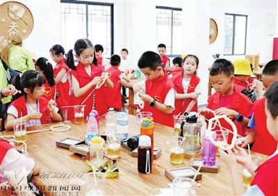 幾公里外的“千鶴桑田”蠶桑文化體驗(yàn)中心,孩子們正跟著研學(xué)導(dǎo)師學(xué)習(xí)蠶桑技藝;