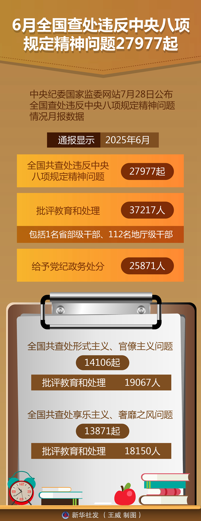 新華社北京7月28日電(記者孫少龍)中央紀(jì)委國家監(jiān)委網(wǎng)站28日公布全國查處違反中央八項(xiàng)規(guī)定精神問題情況月報(bào)數(shù)據(jù)。通報(bào)顯示,今年6月,全國共查處違反中央八項(xiàng)規(guī)定精神問題27977起,批評(píng)教育和處理37217人(包括1名省部級(jí)干部、112名地廳級(jí)干部),給予黨紀(jì)政務(wù)處分25871人。