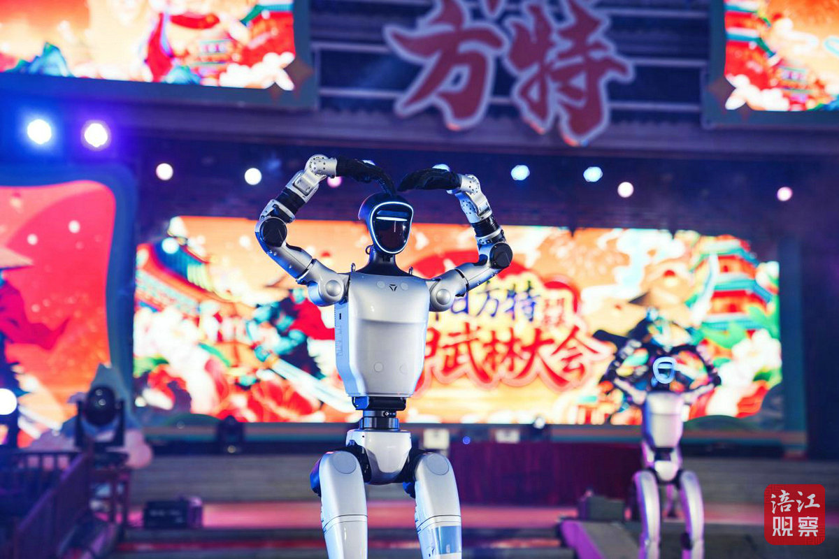 當(dāng)天上午10點,園區(qū)入口已排起長隊。步入清韻小鎮(zhèn),數(shù)臺人形機(jī)器人化身“機(jī)械俠客”,身披斗笠、手持古風(fēng)兵器,一招一式間盡顯武俠風(fēng)骨。游客們紛紛駐足,孩子們興奮地模仿動作,年輕人則舉起手機(jī)記錄這新奇一幕。“沒想到機(jī)器人能這么‘武俠’,太有創(chuàng)意了!”一位年輕游客贊嘆道。