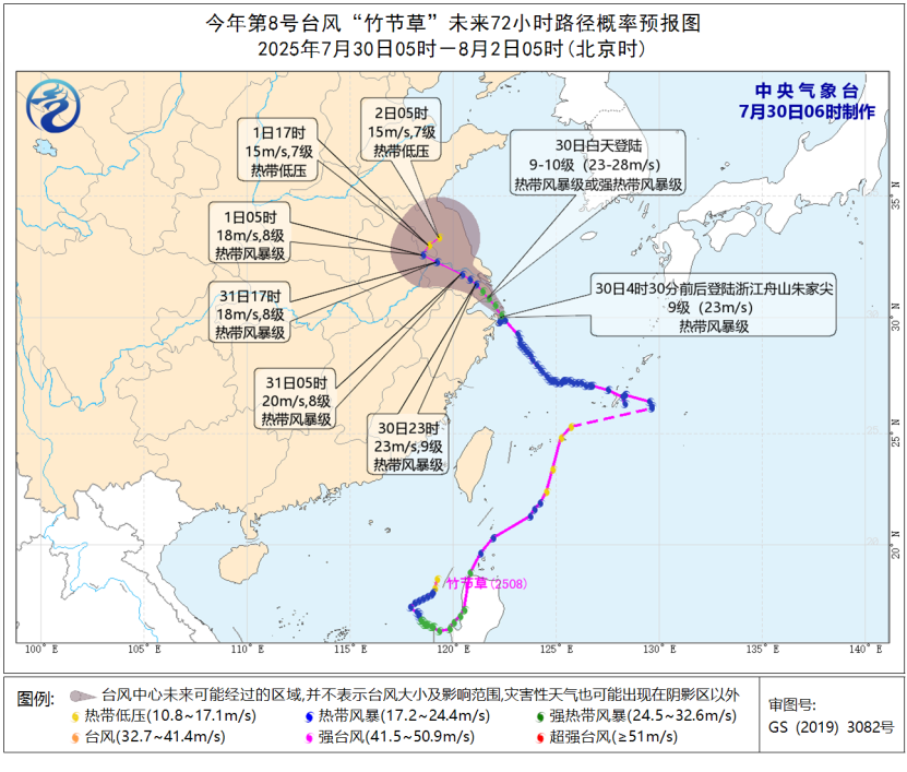 預(yù)計,“竹節(jié)草”將以每小時10-15公里的速度向北偏西方向移動,強度將有所增強,將于30日白天在浙江寧波到江蘇啟東一帶沿海再次登陸(23-28米/秒,9-10級,熱帶風(fēng)暴級或強熱帶風(fēng)暴級),登陸后強度緩慢減弱。