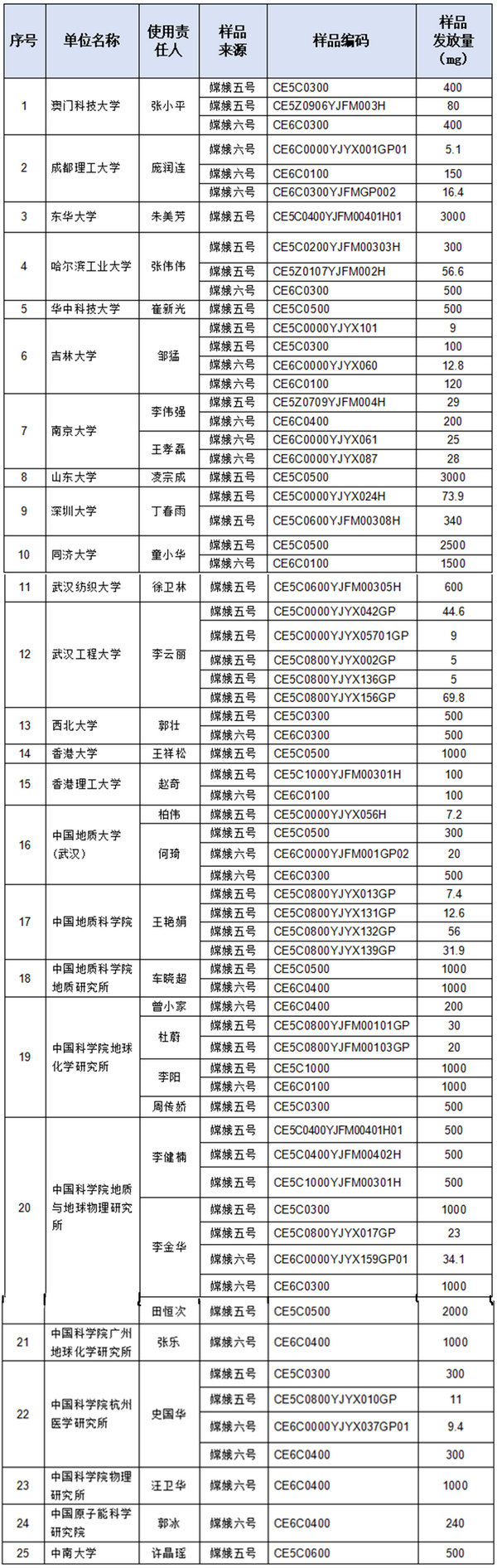 8月2日,中國探月工程發(fā)布關(guān)于發(fā)放國內(nèi)第九批月球科研樣品的公告。2025年7月,探月與航天工程中心組織召開了第九批月球科研樣品借用申請評審會。經(jīng)月球樣品專家委員會評審,探月與航天工程中心審核并報國家航天局批準,最終25家科研機構(gòu)的67份申請獲得通過,對應32名使用責任人,樣品發(fā)放量共計30881.8mg。
