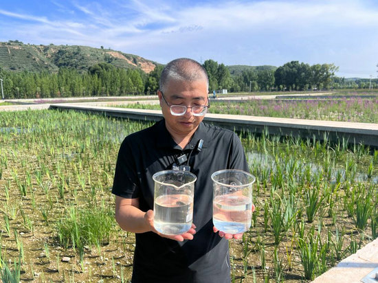 段治軍向記者展示濕地入水口(左)和出水口(右)水樣。新華社記者馬曉潔 攝