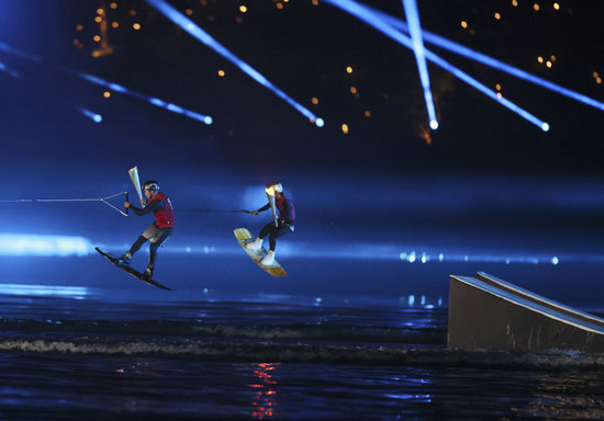 開幕式接近尾聲,中國滑水運(yùn)動(dòng)員以滑水的方式疾馳于湖上,共同點(diǎn)燃主火炬,水火交相輝映,現(xiàn)場(chǎng)再次沸騰。